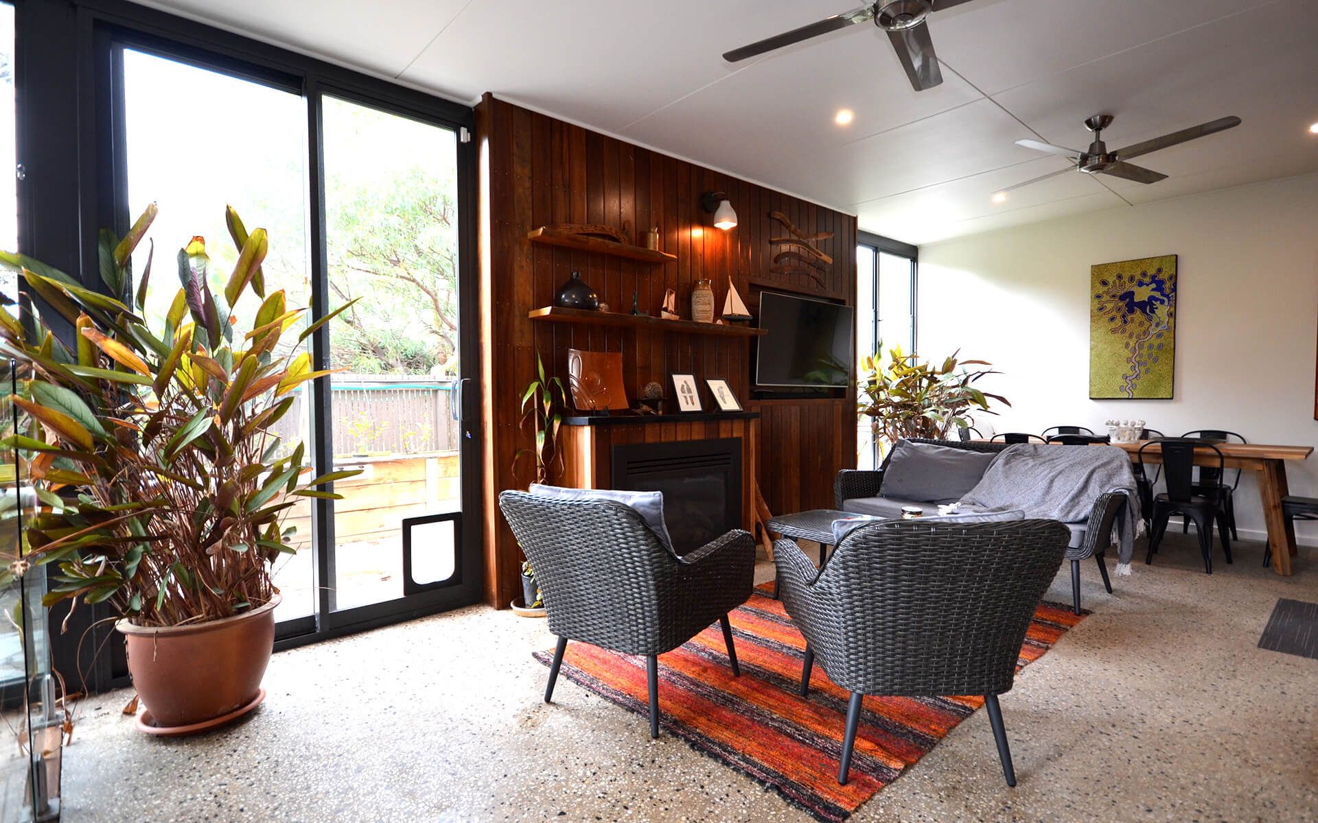 Deceivingly large, the home has an upstairs retreat complete with 3 bedrooms, bathroom, lounge area with kitchenette and balcony overlooking native trees and shrubs.