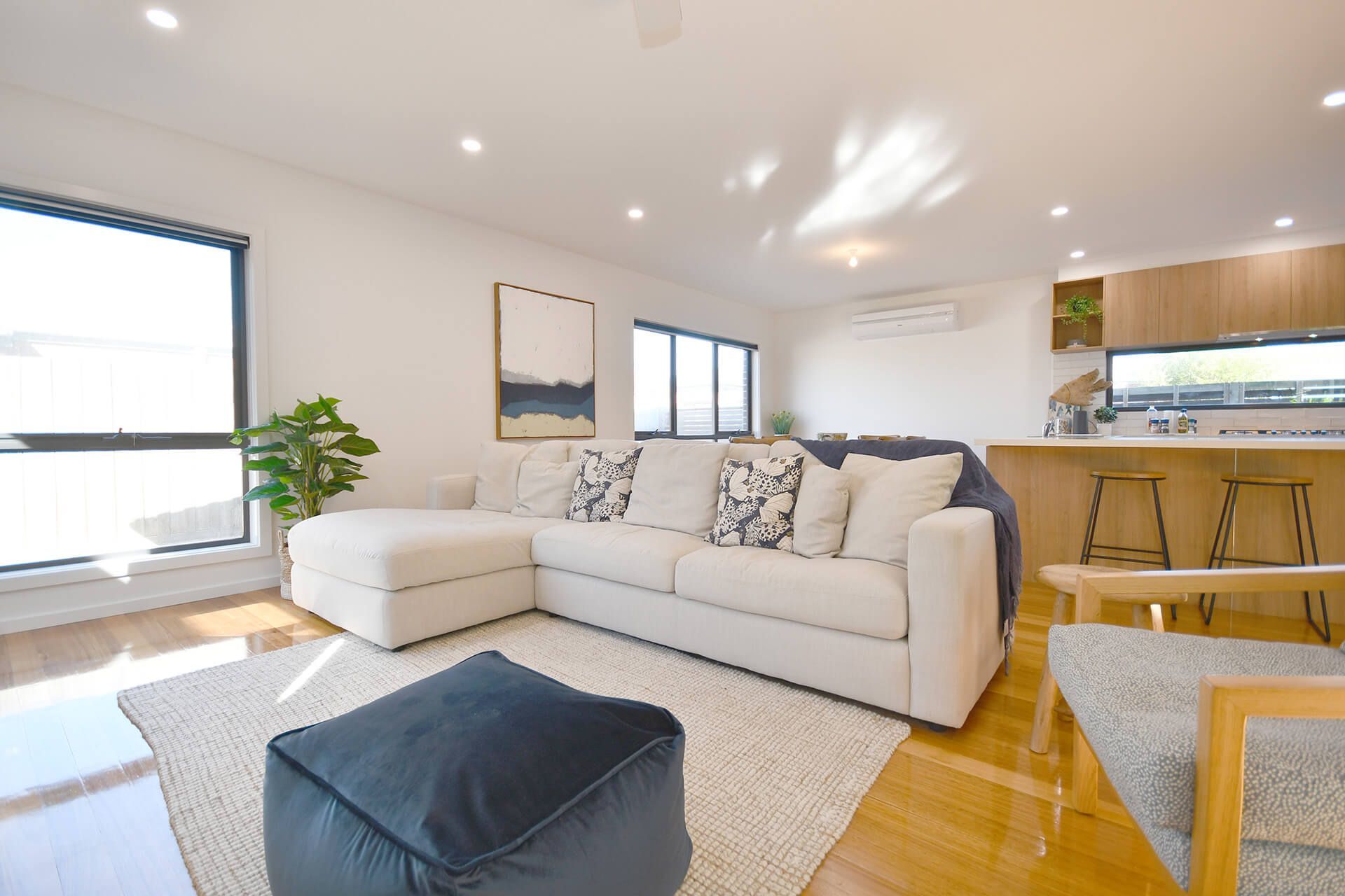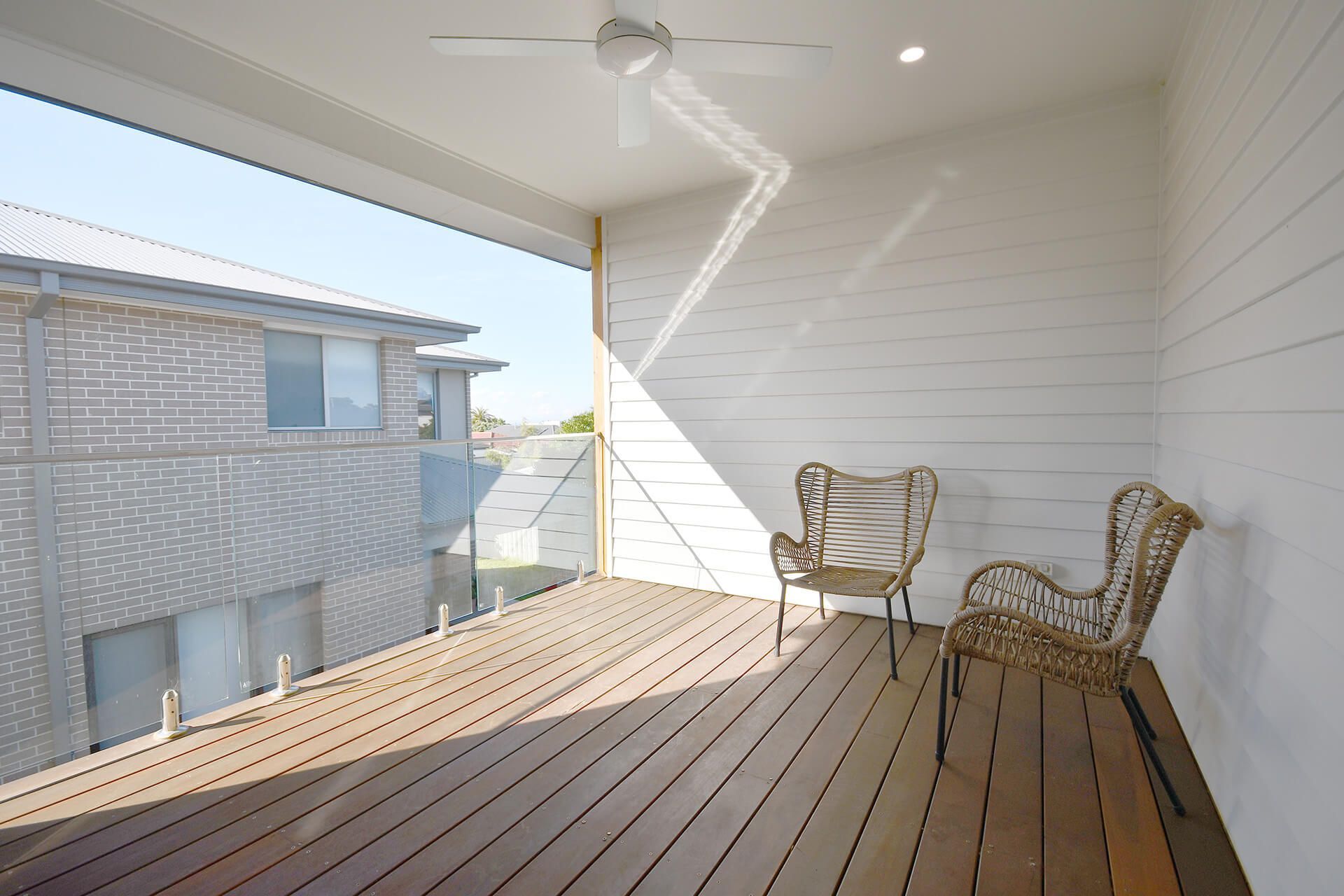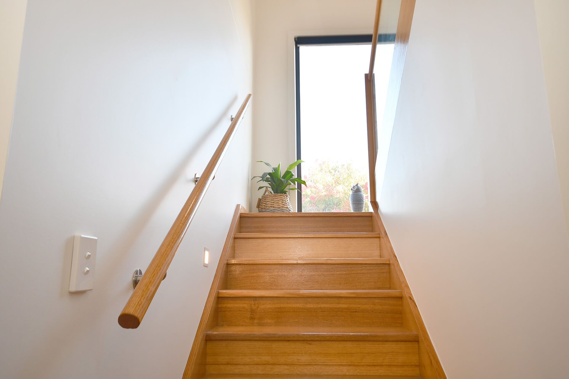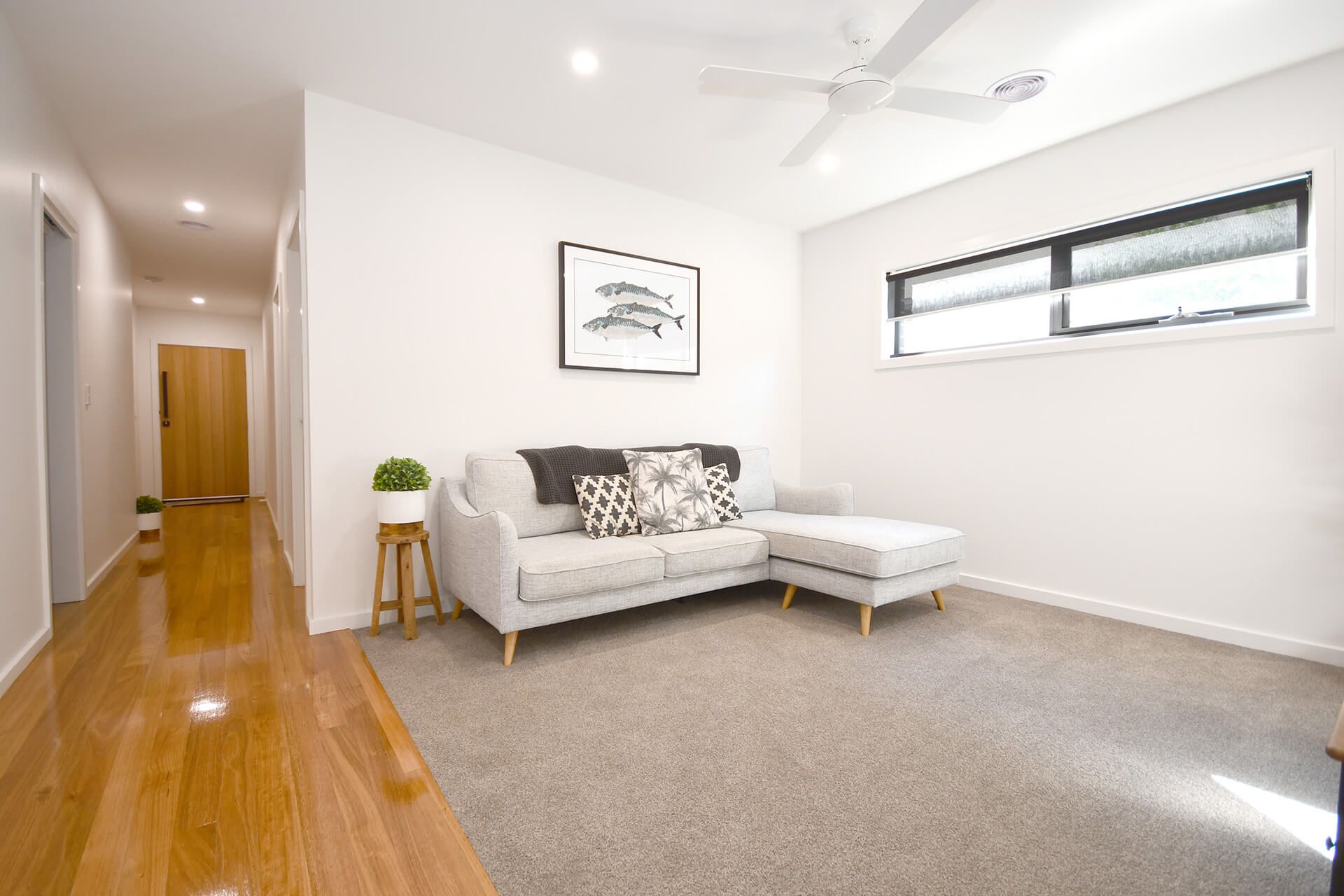 This four bedroom, three bathroom luxurious home is set near the beach at St Leonards, VIC. Hardwood flooring is a feature, as is the stone bench-top in the kitchen. A butlers pantry comes off the kitchen as does the open plan living and dining area. This area leads to a covered outdoor bbq space with a hardwood panelling roof. The double remote garage leads onto the main entry and the polished timber staircase to the second level. An open plan upstairs TV area leads to an outdoor balcony with ceiling fan for those war summer nights.